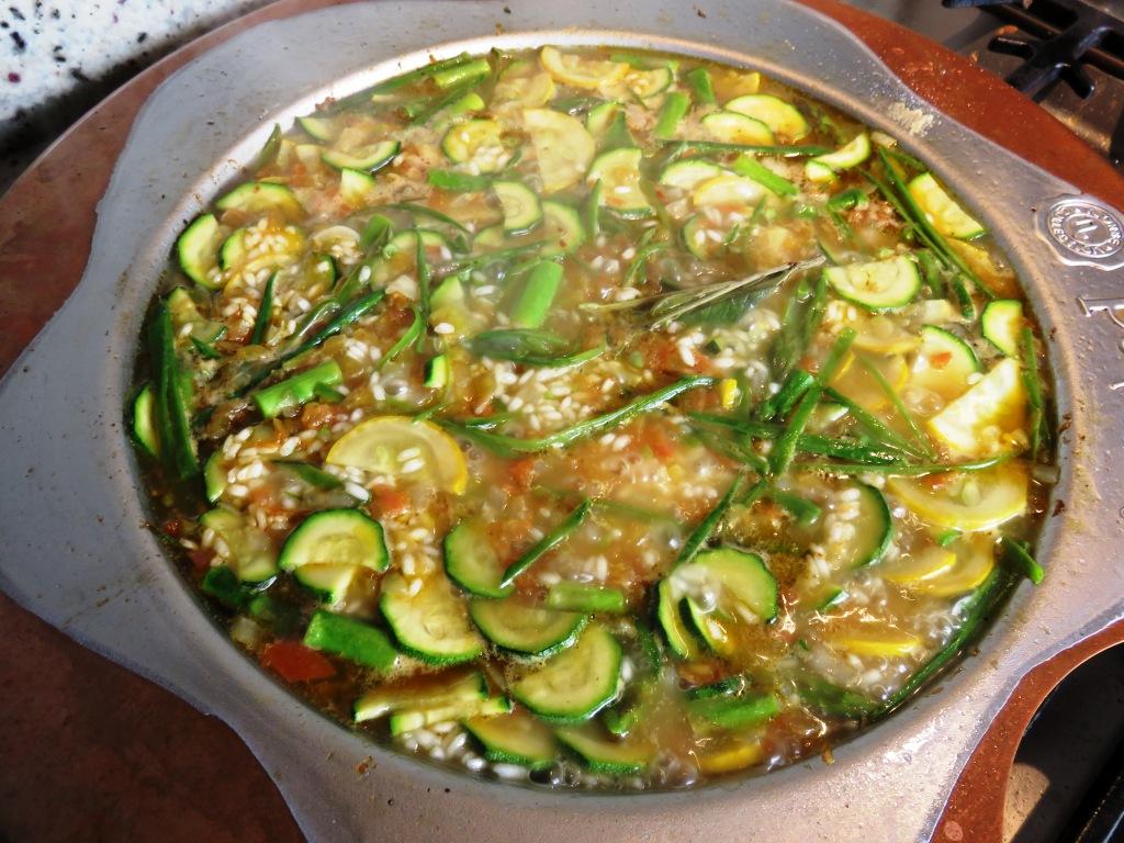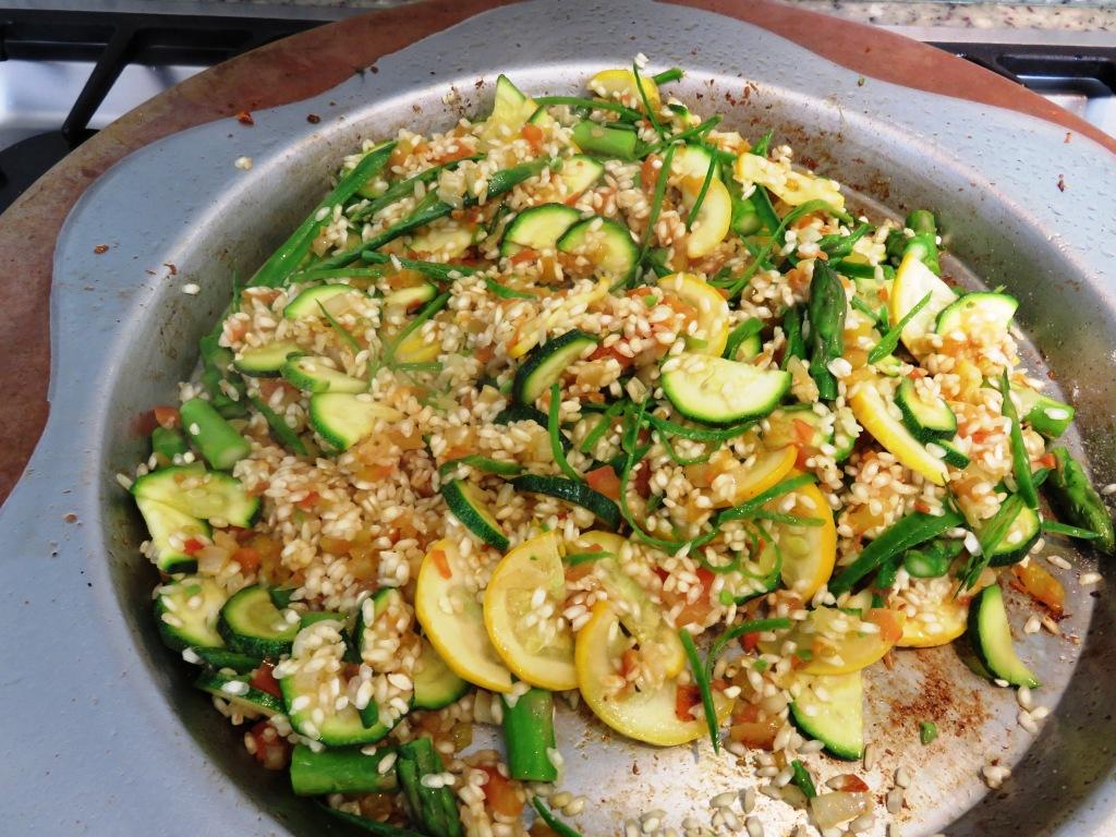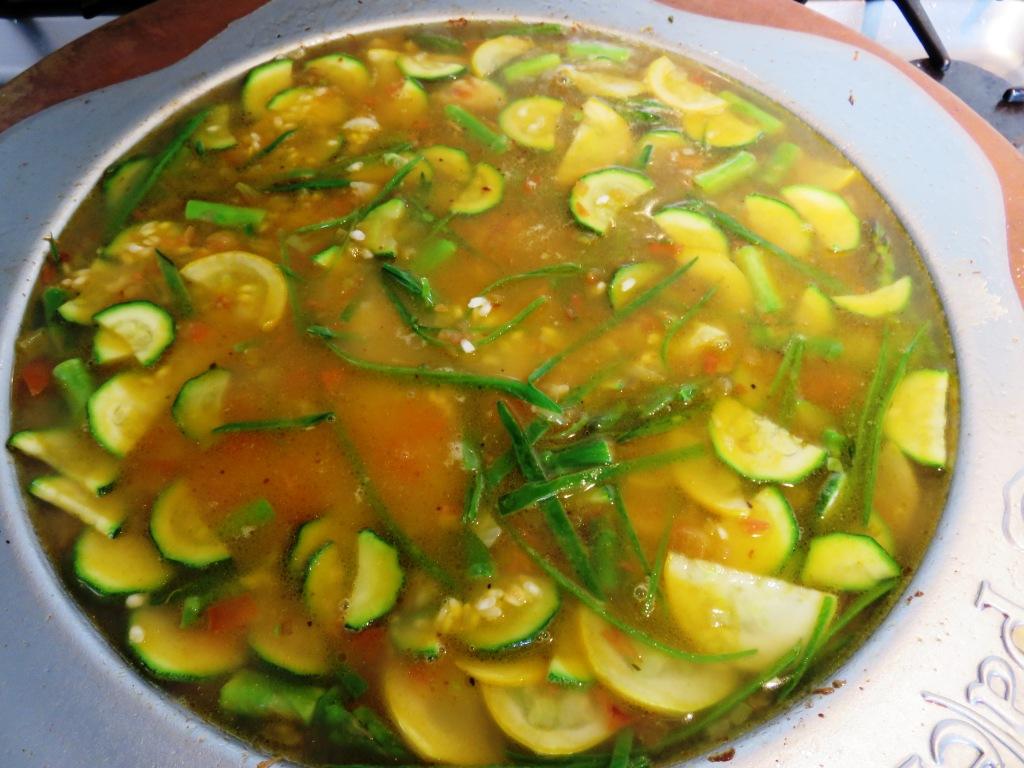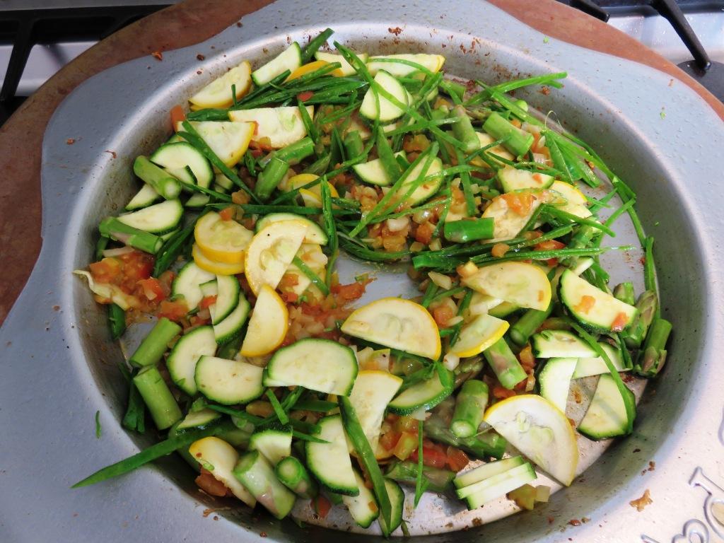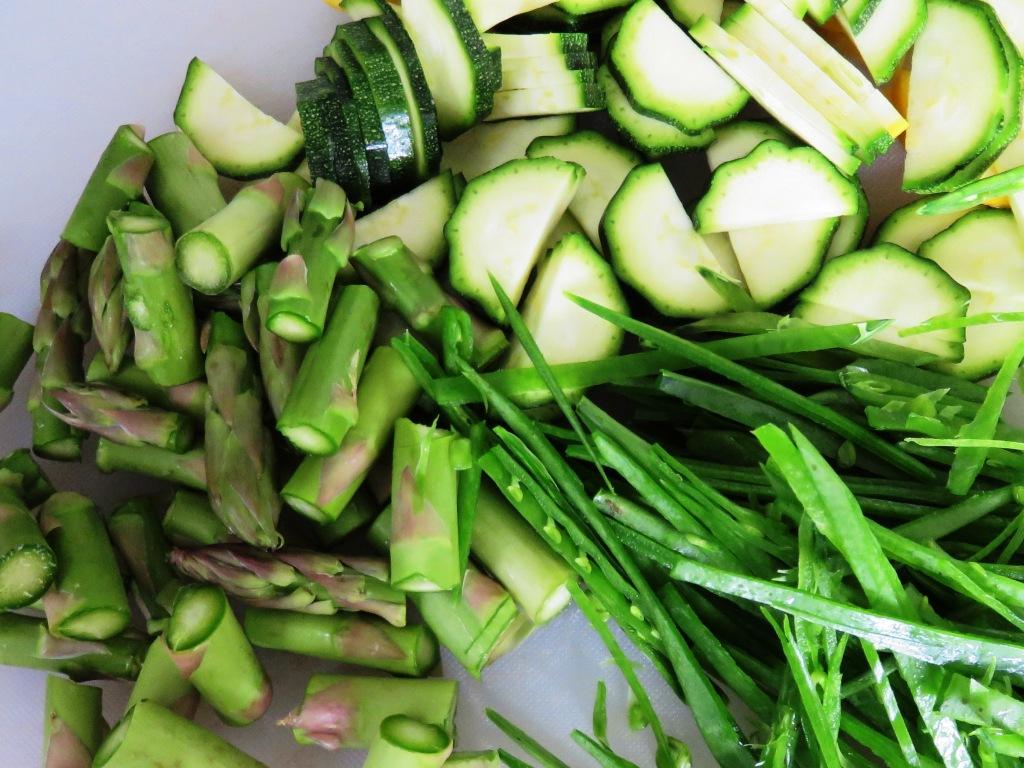 - Corte el zuchini, los guisantes y los esparragos en trozos pequeños y agreguelos al sarten cuando la cebolla esté transparente. Sofría por 3 minutos incorporando los ingredientes.