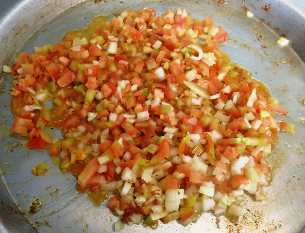- Pique finamente el tomate y la cebolla. En el mismo sartén agregue dos cucharadas de aceite de oliva y sofria el tomate y la cebolla hasta que la cebolla esté transparente.