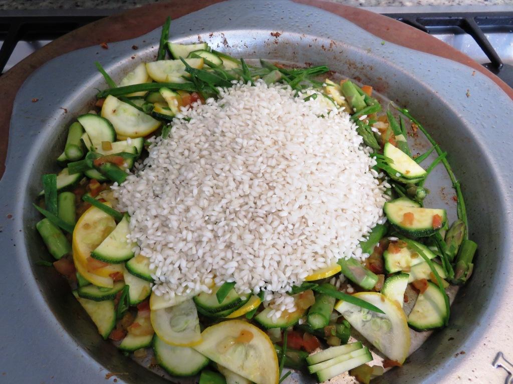 - Agregue el arroz, dos cucharadas adicionales de aceite de oliva, revuelva bien y deje sofreir por 5 minutos mas revolviendo de vez en cuando.