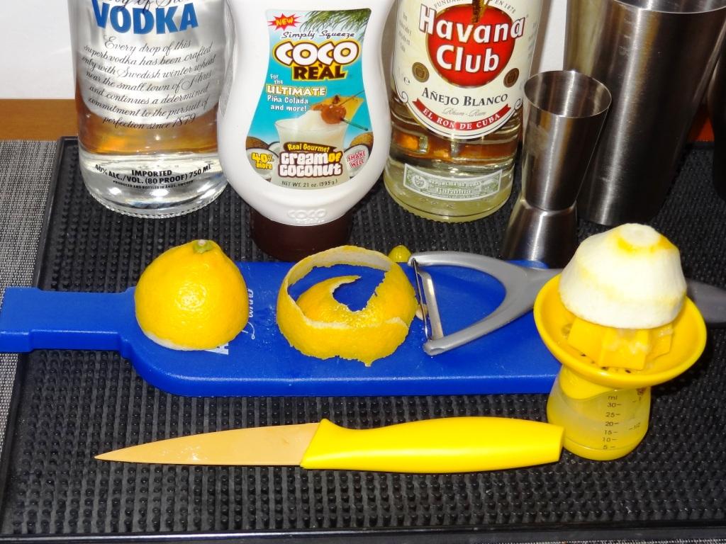 - Llene la mitad de la coctelera con hielo, y utilizando la copa medidora vierta en la coctelera los demás ingredientes: Ron, vodka, jugo de limón y crema de coco.