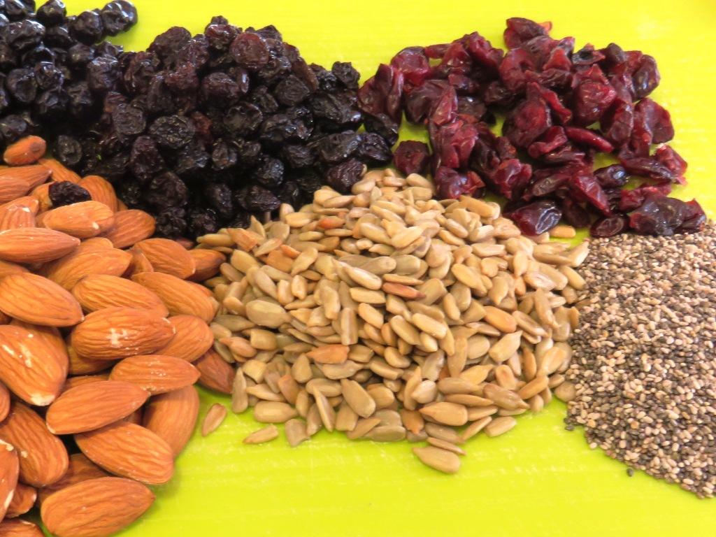 - Cortar las almendras por la mitad. Mezclar con la avena, las semillas y pasas en un bowl.