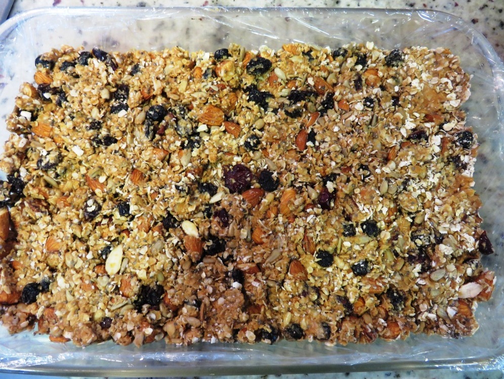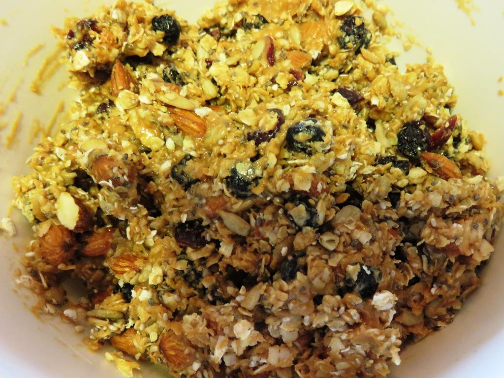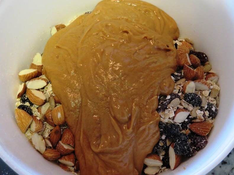 Verter la mezcla de mantequilla de mani y miel sobre los ingredients secos, y mezclar hasta que quede incorporado de manera pareja. - Verter la mezcla en la refractaria, presionándola para que quede bien compacta y pareja.