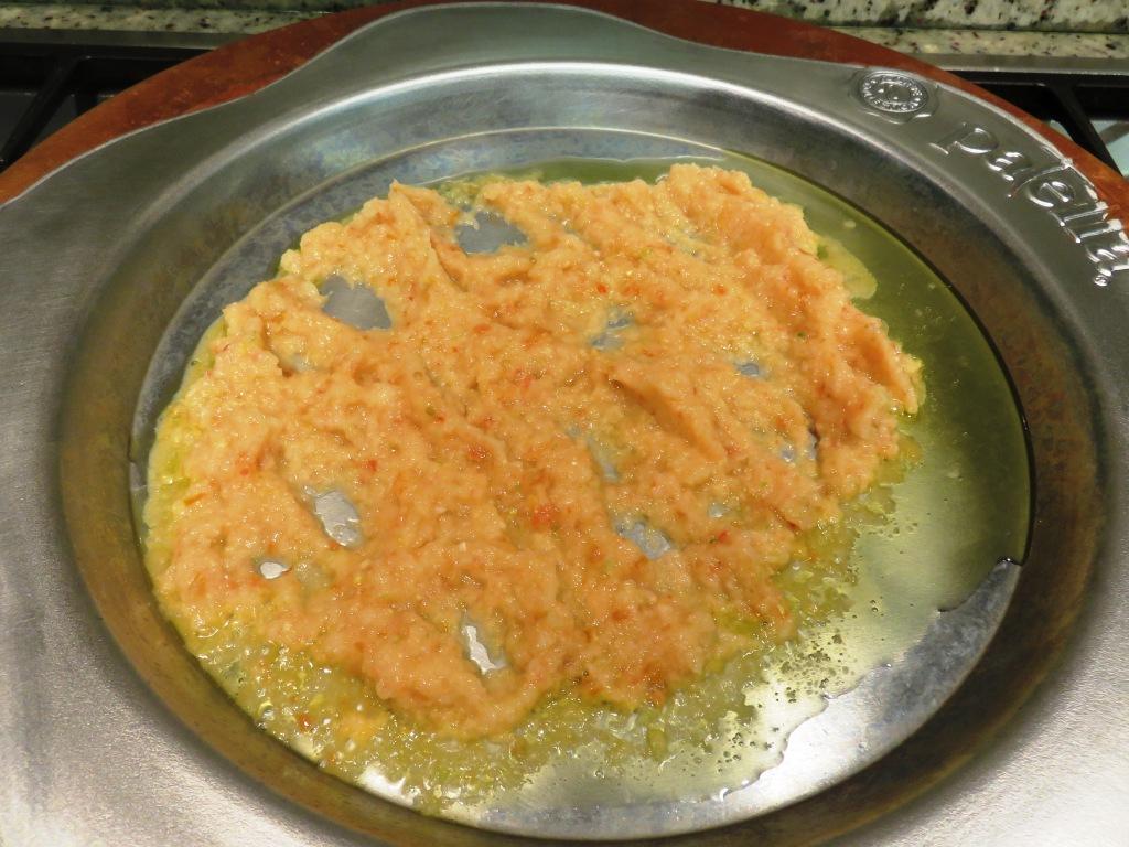 - Caliente a fuego alto una paellera o un sarten grande (nosotros usamos una Patella – ver Casa Benigna) con tres cucharadas de aceite de oliva.