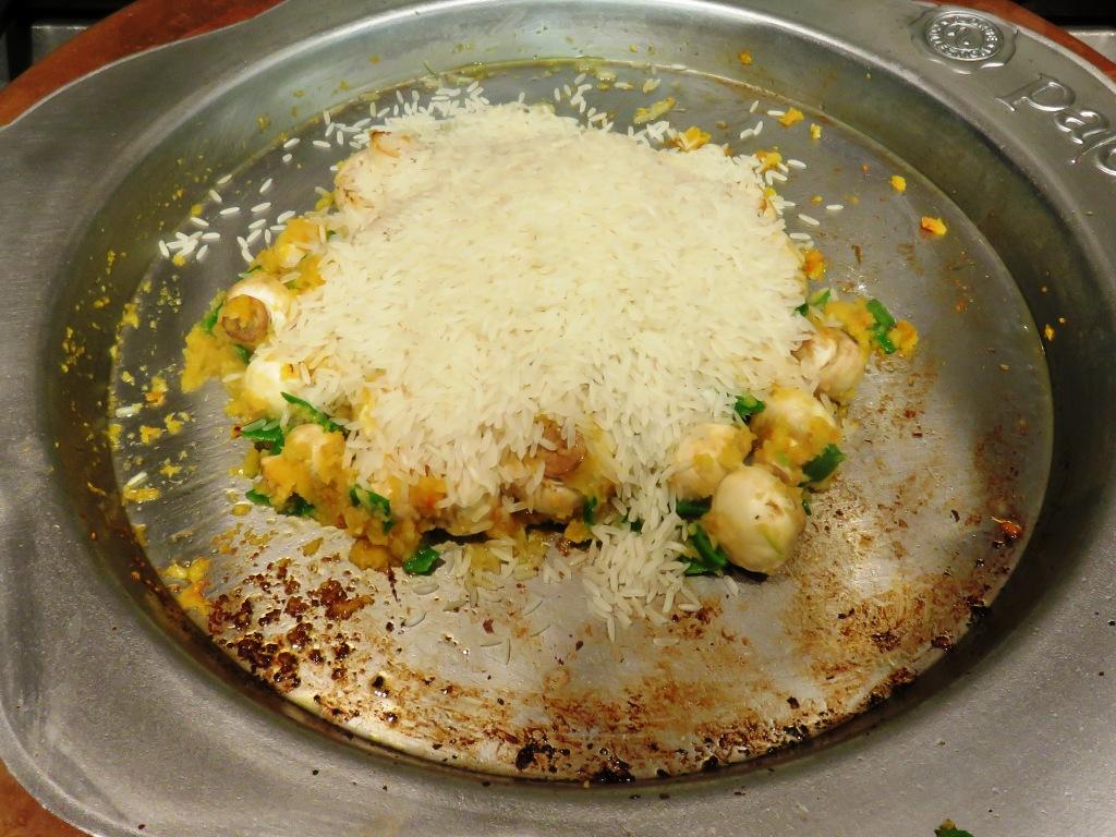 - Agregue el arroz, otra cucharada de aceite de oliva, revuelva y continué sofriendo la mezcla completa por otros 3 minutos.