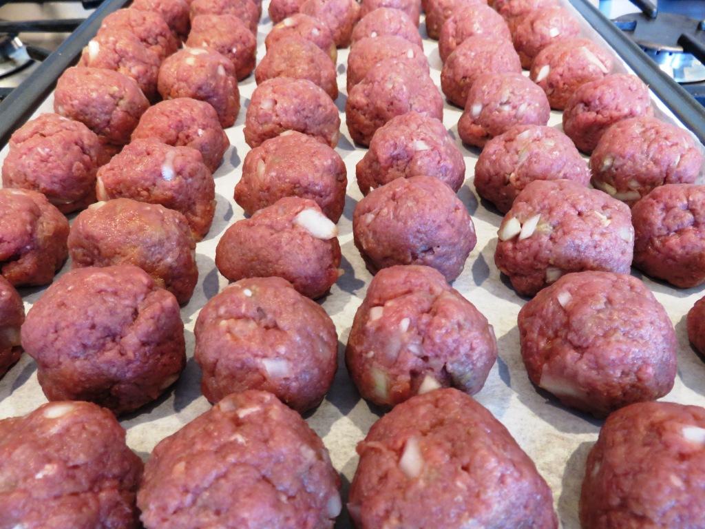 - Mezcle bien todos los ingredientes de las albóndigas y forme bolitas de unos 2cm de diametro (esta cantidad de carne debe alcanzar para 60) y coloquelos en la bandeja.