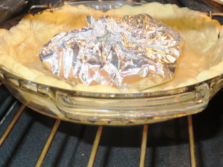 - Precalentar el horno a 350F. Sacar el molde del congelador, cubrir con un trozo de papel aluminio o pergamino de 40x40cm y llenar hasta 2/3 con frijoles (esto es para evitar que se infle) y hornear por 20 minutos.
