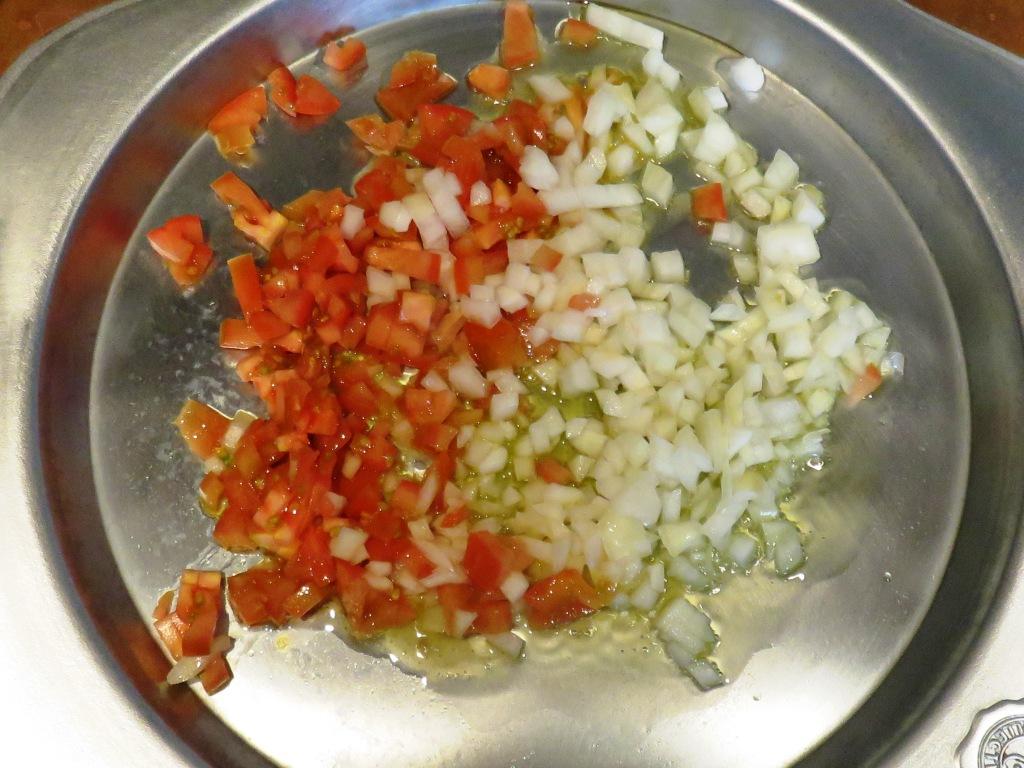- Haga un picado fino del tomate con la cebolla y sofría a fuego medio en aceite de oliva en una sarten grande poco profunda hasta que la cebolla esté transparente (en este caso usamos una sarten mediana para paella)