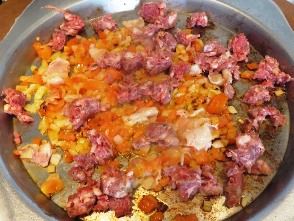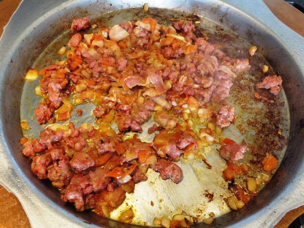 - Con un cuchillo abra los chorizos y saque el relleno (descarte la tripa). Deshaga y agregue al sofrito hasta que la carne del chorizo hasta que esté bien cocida.