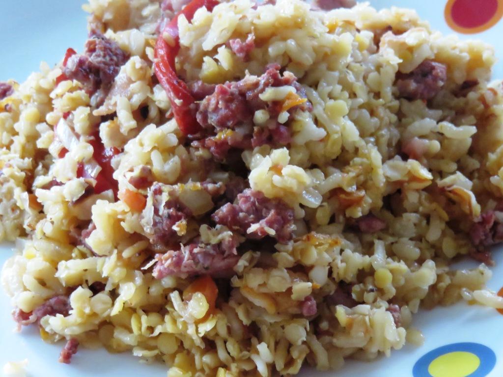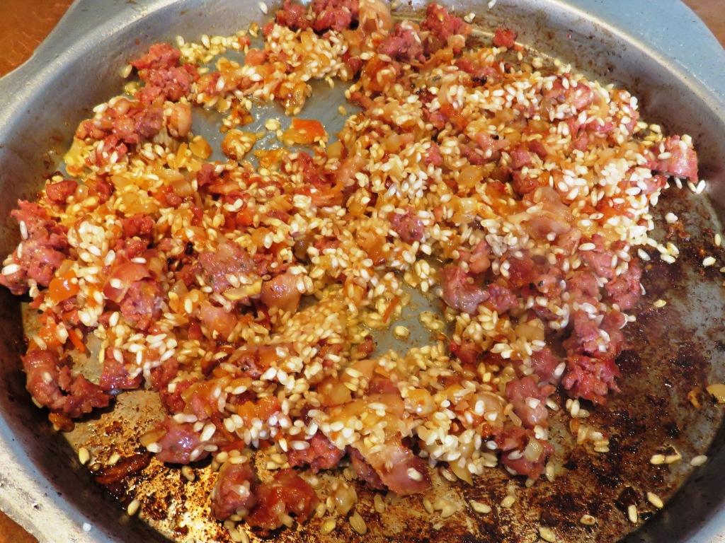 - Cuando la carne del chorizo esté bien cocida, agregue el arroz y mezcle dejando que este se incorpore bien al sofrito
