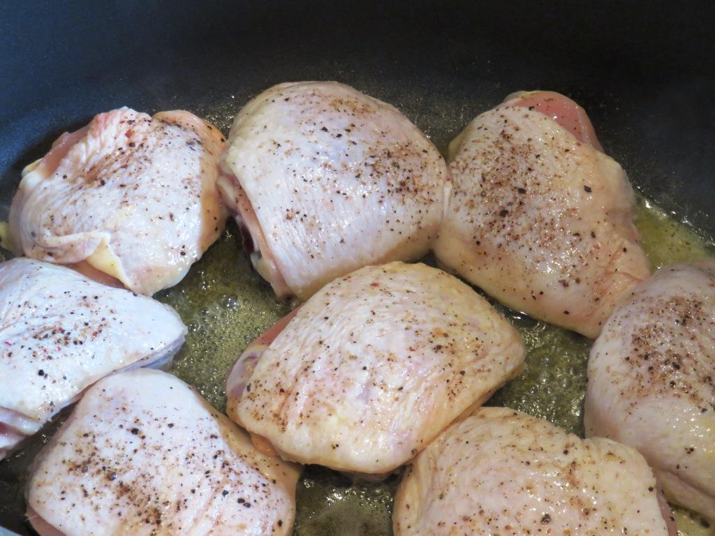 - Ponga a fuego alto una olla grande con tapa pesada (ojalá sea una cacerola de brasear para que sea mas fácil) y derrita la mantequilla. Ponga a dorar el pollo por ambos lados, va a quedar aun crudo y solo buscamos el dorado de la piel y que suelte un poco de grasa. Una vez esté dorado retírelo del fuego y póngalo a escurrir la grasa sobrante en una bandeja con rejilla o en unas toallas de papel.