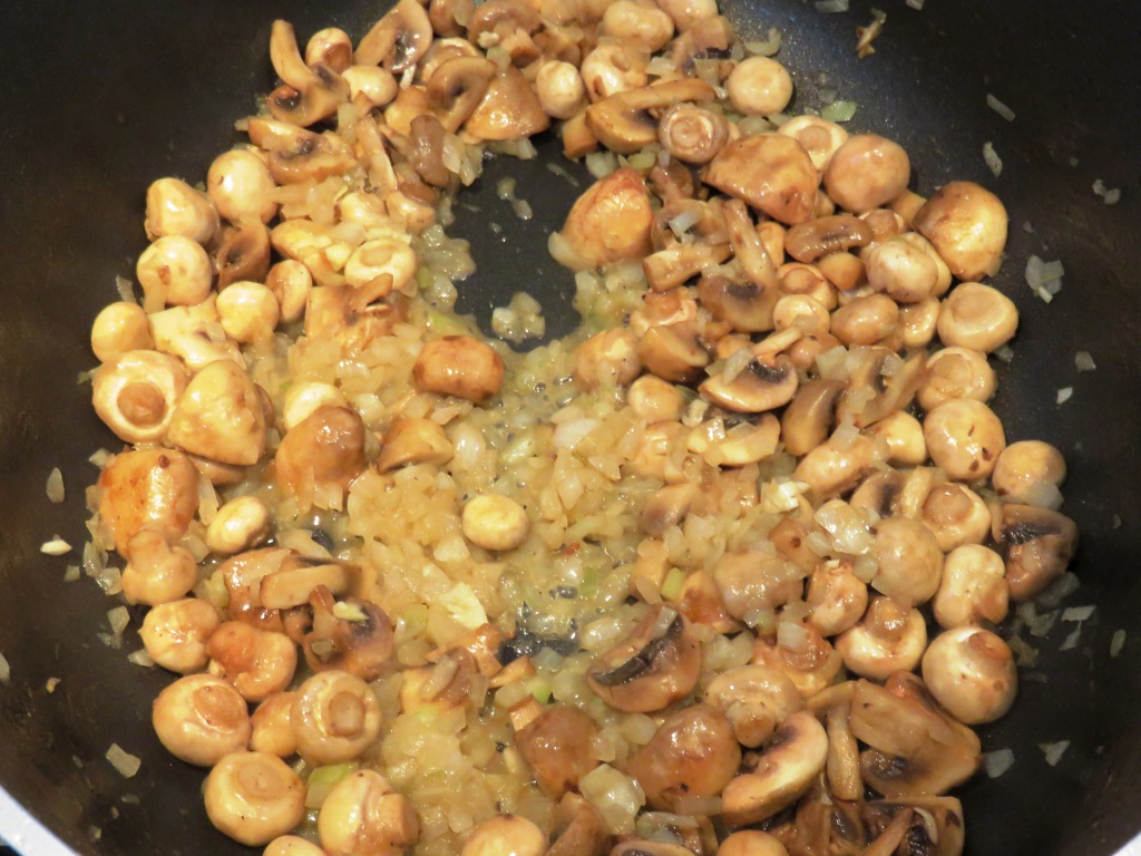 - De la grasa que queda en la olla deje solamente dos cucharadas y descarte el resto. Baje a fuego medio y agregue la cebolla y los champiñones revolviendo hasta que la cebolla esté transparente; en ese momento agregue el ajo y revuelva por 1 minuto mas.