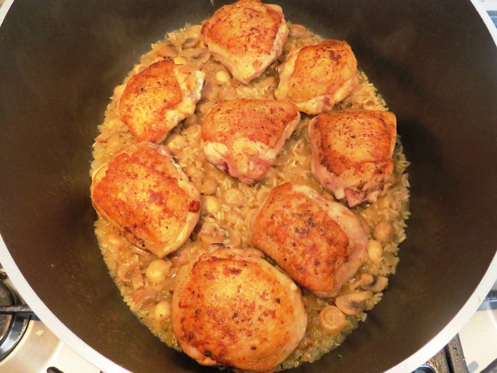 - En este punto el arroz aun no está bien cocido y requiere unos 20-25 minutos mas de cocción, coloque las presas de pollo encima del arroz y tape bien la olla; asi se terminará de cocinar el pollo en los vapores del arroz.
