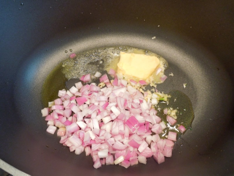 - Se sofríe el ajo y la cebolla en una mezcla de aceite y mantequilla durante unos segundo