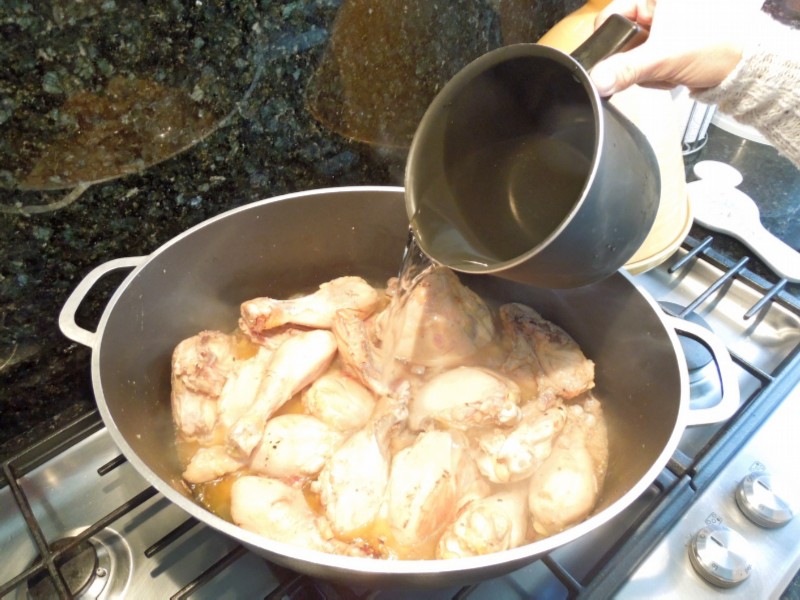 - Se añade la sal, la pimienta, el jengibre en polvo, el azafrán y luego se pone suficiente agua para tapar completamente el pollo y se deja hervir.