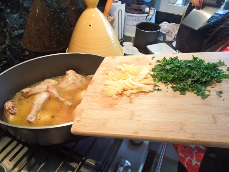 - Luego se añaden el perejil, las aceitunas partidas a la mitad, y la piel de los limones confitados partidos en julianas (tener en cuenta que el sabor de los limones es fuerte y salado para que las julianas sean pequeñas)