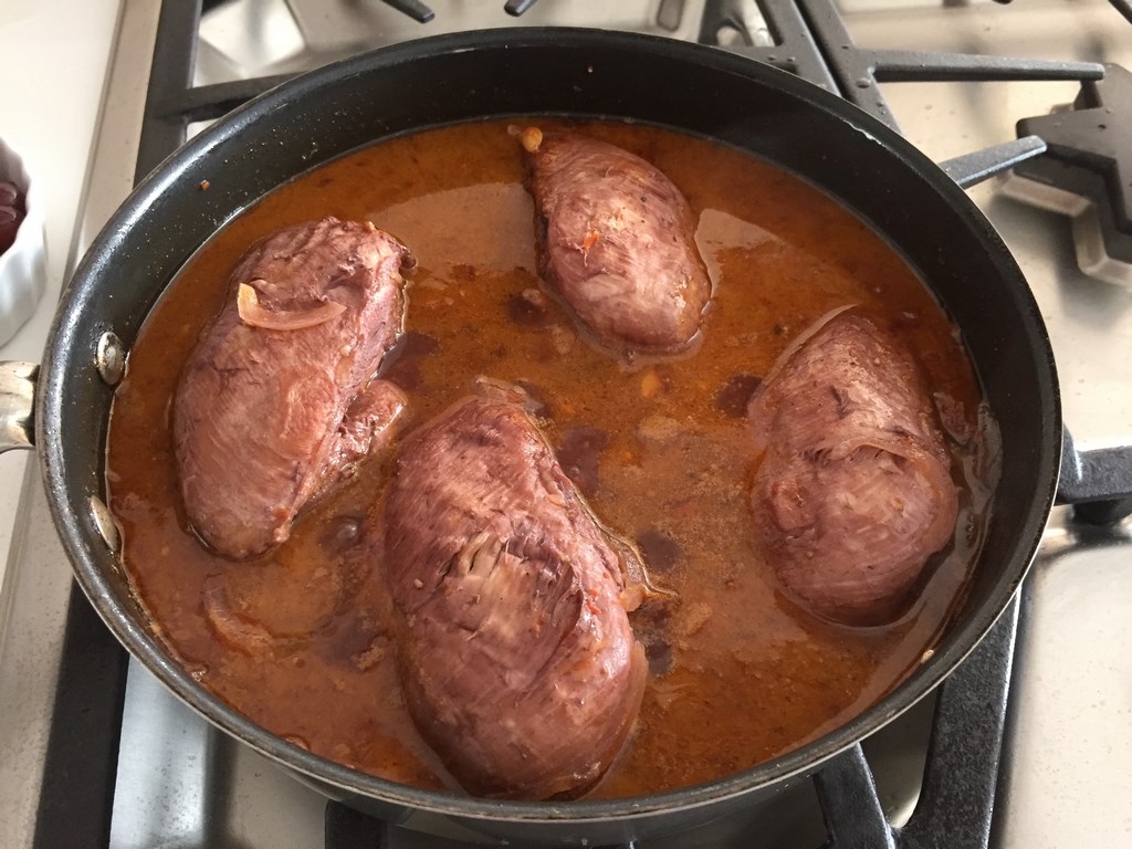 - Agregue el agua y el vino, revuelva bien y reintegre las pechugas agregando sal y pimienta.