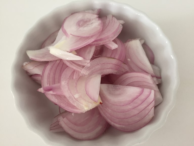 - Corte la cebolla en tajadas delgadas, eliminando la punta y el tallo.