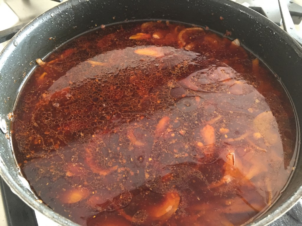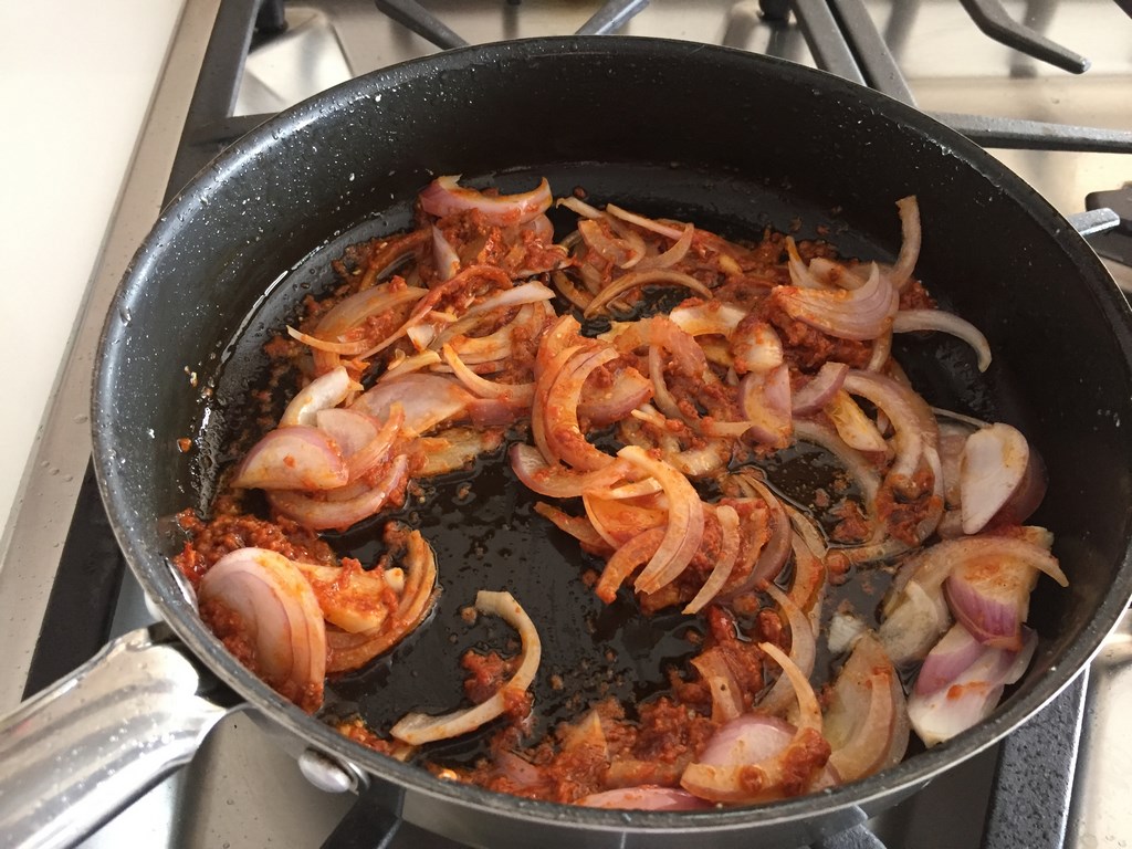 - Baje a medio la temperatura del sarten, y en el mismo aceite agregue otra cucharada de aceite de oliva, el pesto rojo y la cebolla. Revuelva bien y sofría hasta que las cebollas estén blandas (no doradas), si es necesario revuelva suavemente.