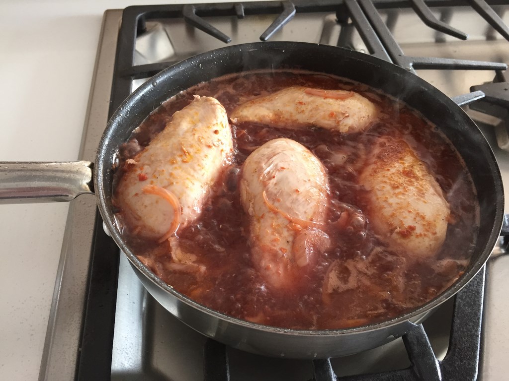 - Cuando llegue al primer hervor, tape el sarten y pase el fuego a bajo. Mantenga cocinando por 20 minutos o hasta que las pechugas esten bien cocinadas y blandas. De vuelta a las pechigas de vez en cuando.