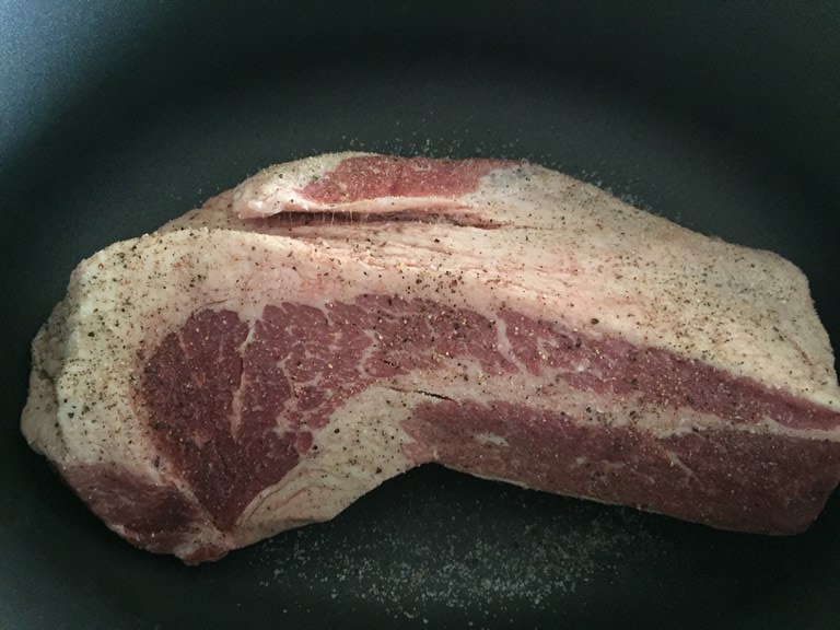 - Precaliente el horno a 325F y sazone generosamente con sal y pimienta la carne.