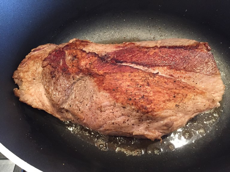 - En el caldero (dutch oven) caliente a fuego medio el aceite y selle la carne por todos los lados (10 minutos)