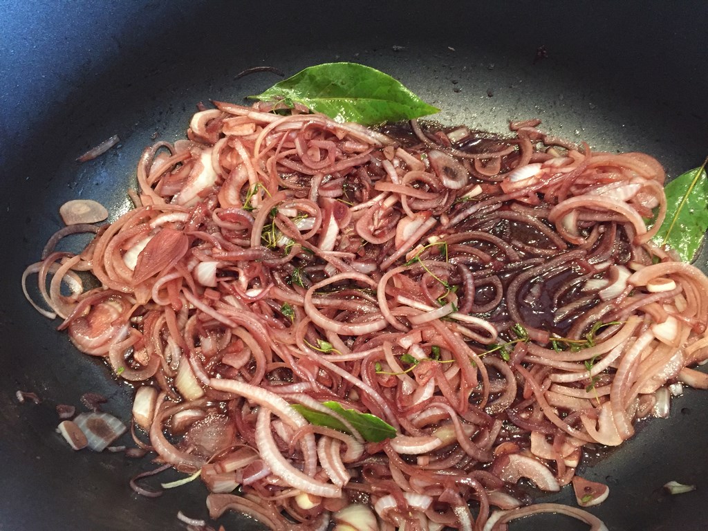 - Retire la carne del caldero, y en los jugos remanentes agregue la cebolla, el ajo, el tomillo, el laurel, el vinagre balsamico y 1/2 taza de vino. Cocine revolviendo frecuentemente hasta que las cebollas esten blandas y la mezcla fragante. (5 minutos)