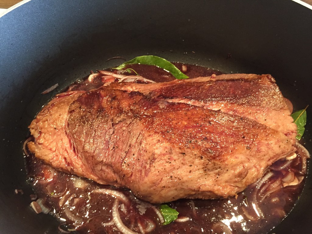 - Coloque la pieza de carne encima de las cebollas y esparza la mezcla de miel y vino encima de la carne. Tape el caldero y hornee por 2 horas.