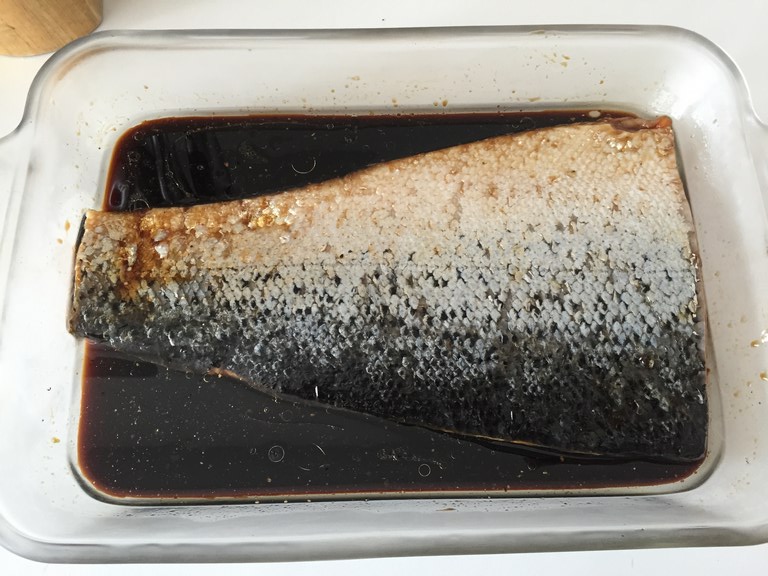 - Colocar el salmón con la piel hacia arriba en una refractaria y vaciar la mezcla anterior. Tapar con papel film y meter a la nevera por 2 horas.
