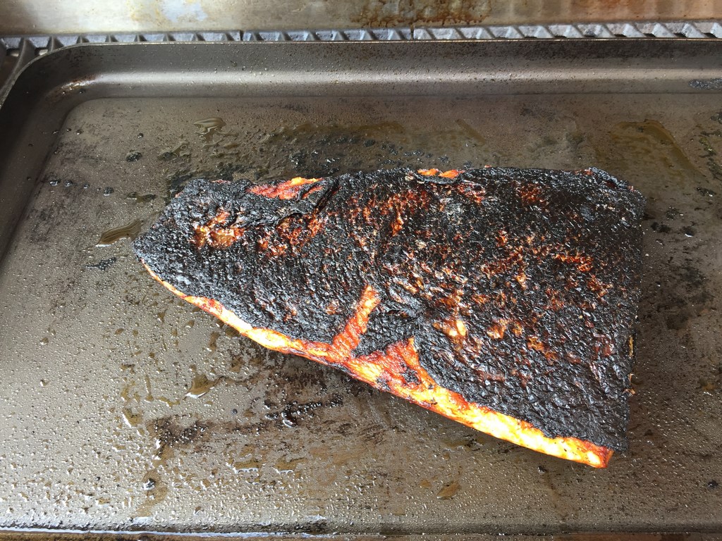 - Coloque la plancha a fuego medio y ponga el salmon con la piel hacia abajo por 10 minutos. La piel se va a tostar pero protejerá la carne.